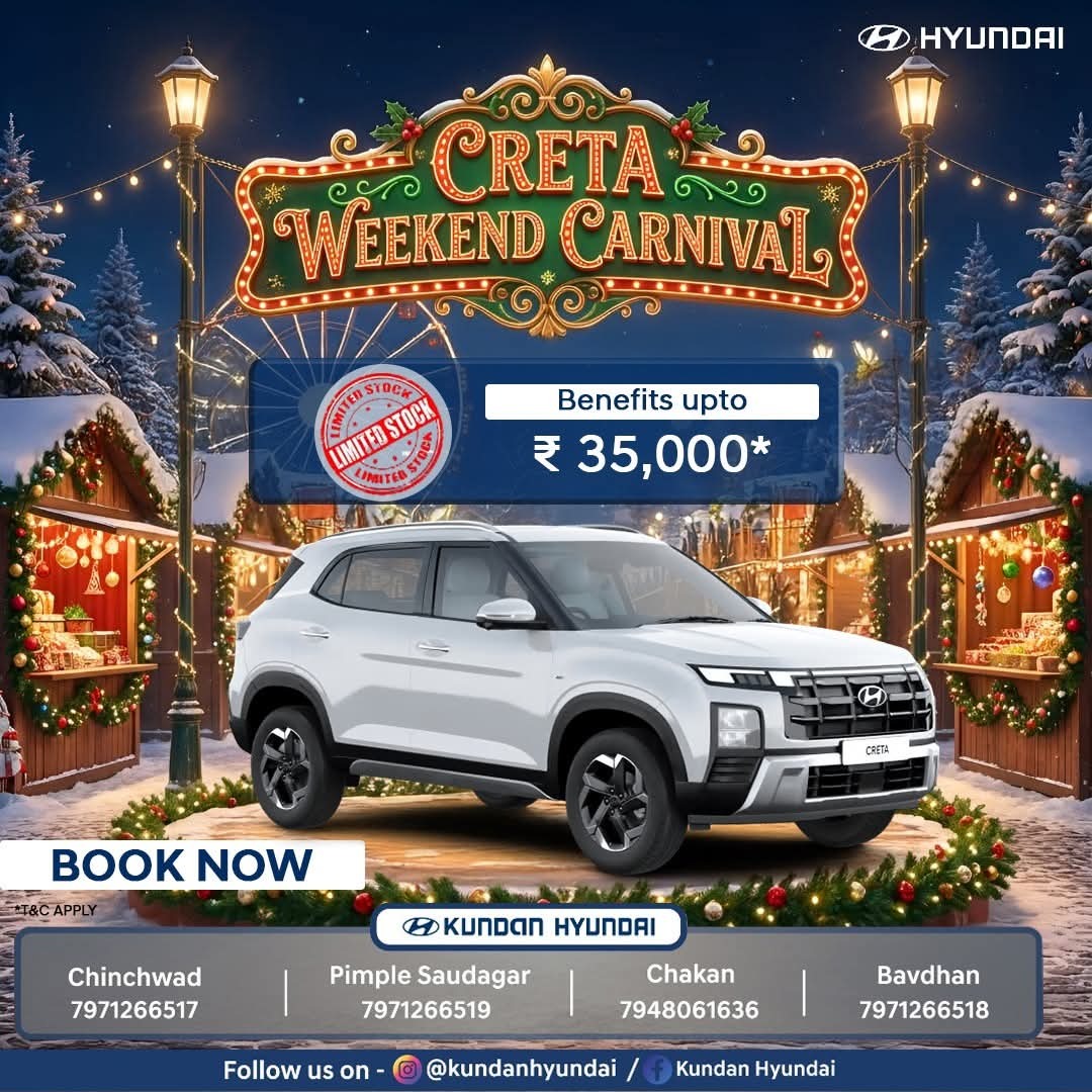 ✨ India’s favourite SUV just got better! Bring home the Hyundai CRETA with benefits up to ₹35, 000* Power, comfort & style — all in one. Offer valid for limited period only. #HyundaiCreta #Creta #HyundaiIndia #SUVLife #TopSellingSUV #CarOffers #LimitedTimeDeal #UpgradeYourDrive #HyundaiLove #AutoDeals #kundanhyundai