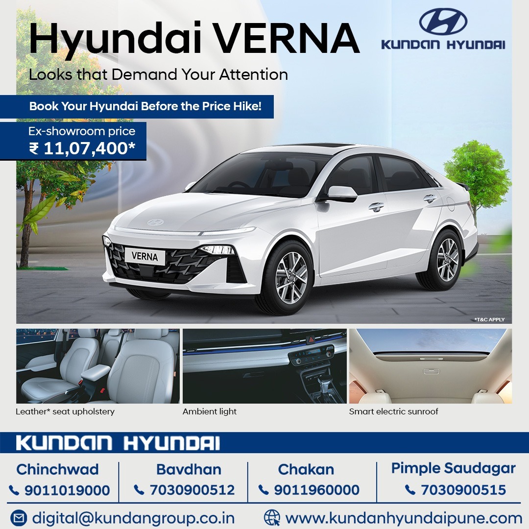 Bold design, advanced tech, and turbocharged performance – The Hyundai VERNA is now available in Baner and Aundh. Drive the difference with the all-new Hyundai VERNA – book a test drive in Bavdhan, Kothrud, or Karve Road. Experience next-level comfort and futuristic features with VERNA at Kundan Hyundai in Warje and Pashan. The VERNA’s turbo GDi engine is ready to thrill you in Shivajinagar, Deccan, and Pune city center. Hyundai Verna in Pune Hyundai Verna turbo petrol in Baner and Aundh Hyundai Verna on-road price in Kothrud and Bavdhan Book Hyundai Verna near Karve Road and Warje Hyundai Verna showroom in Shivajinagar and Deccan Verna test drive near Wakad and Pimple Saudagar Hyundai Verna SX and SX (O) variants Pune Hyundai Verna top model price in Hinjewadi Hyundai Verna 1.5 Turbo GDi in PCMC Kundan Hyundai Verna Pune showroom